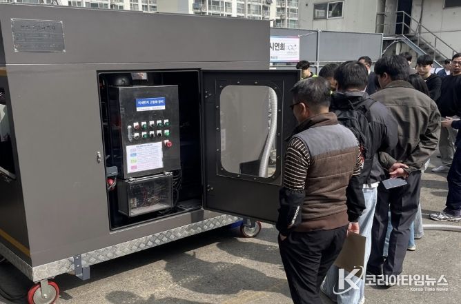 우선 수소 전기 노면 분진 청소차는 기존 경유 청소차가 따로 수행하던 노면 청소와 분진 흡입을 동시에 처리하면서, 환경부 기준(95%)을 크게 뛰어넘는 미세먼지 98.8%, 모래 99.7% 흡입 성능을 현장에서 입증했다. 특히 전국 최초로 흡입한 것을 쓰레기, 미세먼지, 초미세먼지 등 3단계로 분리해 수거하고 수거량을 실시간으로 확인할 수 있어 참석자들의 큰 호응을 얻었다.