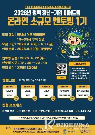 코리아타임뉴스 경제팀 | 평택시는 기업 현직자들의 취업 멘토링을 통해 실질적인 취업 준비를 지원하고 인적 네트워크 형성 기회를 제공하기 위한 평택 청년-기업 이어드림 ‘온라인 소규모 멘토링 1기’ 참여자를 오는 4월17일까지 모집한다.