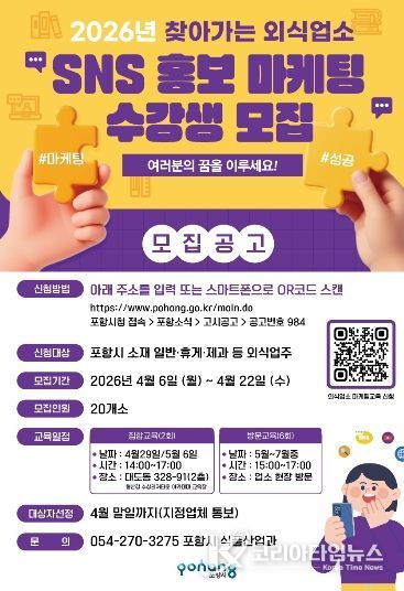 코리아타임뉴스 경북취재본부 | 포항시는 지역 외식업소의 자생력과 온라인 홍보 역량 강화를 위해 ‘2026년 찾아가는 외식업소 SNS 마케팅 교육’ 참여 업소를 모집한다.