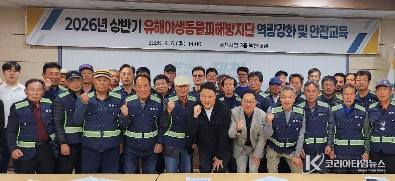 코리아타임뉴스 충북취재본부 | 제천시는 지난 4일 시청 박달재실에서 유해야생동물 피해방지단과 시청, 야생생물관리협회, 국민안전교육센터 관계자 등 40여 명이 참석한 가운데 ‘2026년 유해야생동물 피해방지단 역량 강화 및 안전교육’을 실시했다.