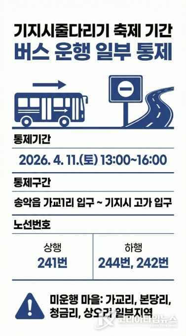 이번 통제는 4월 11일 오후 1시부터 4시까지 3시간 동안 송악읍 가교1리 입구~기지시 고가 입구 구간에서 실시한다. 해당 시간 동안 시내버스 상행 241번, 하행 244번, 242번 노선은 해당 구간을 우회 운행한다.