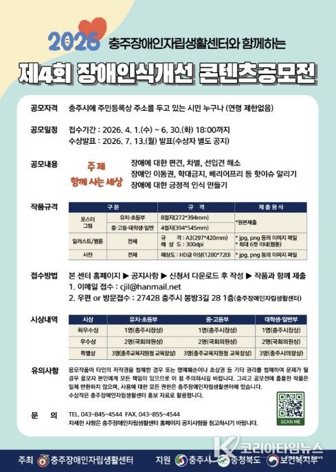 코리아타임뉴스 박찬식 기자 | 충주장애인자립생활센터는 제46회 장애인의 날을 맞아 장애에 대한 사회적 이해와 공감을 높이고, 차별 없는 지역사회를 조성하기 위한 ‘2026년 장애인식개선 콘텐츠 공모전’을 개최한다.