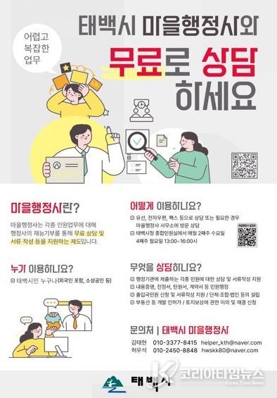 코리아타임뉴스 이아름 기자 | 태백시는 시민들이 일상에서 겪는 복잡한 행정 문제를 신속하게 해결할 수 있도록 4월부터 ‘마을행정사’ 운영을 시작한다고 밝혔다.
