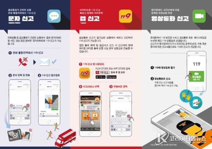다매체 119 신고서비스는 기존 음성통화 방식 외에도 문자(SMS), 영상통화, 스마트폰 애플리케이션 등을 활용해 신고할 수 있는 제도다.