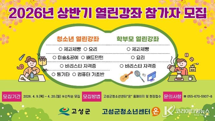 코리아타임뉴스 경남취재본부 | 고성군청소년센터“온”은 지역 청소년과 학부모를 대상으로 ‘2026년 상반기 열린강좌’ 참가자를 모집하고 있다고 밝혔다.
