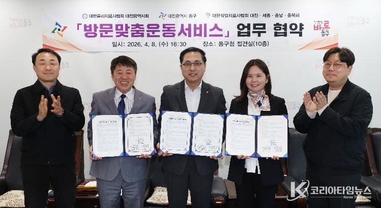 코리아타임뉴스 의료보건팀 | 대전 동구는 지난 8일 의료요양 통합돌봄사업의 원활한 추진을 위해 대한물리치료사협회 대전시회(회장 김성호)‧대한작업치료사협회 대전세종충남충북회(회장 유지애) 등 방문운동서비스 제공기관 2곳과 업무 협약을 체결했다고 밝혔다.