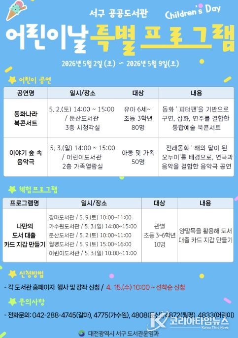 코리아타임뉴스 대전취재본부 | 대전 서구 갈마·가수원·둔산·월평·어린이도서관은 내달 2일부터‘어린이날 특별 프로그램’을 운영한다.
