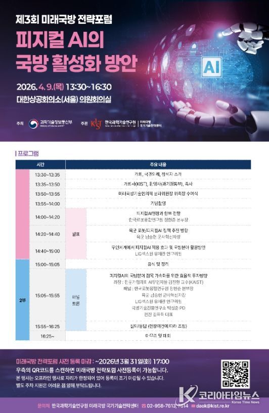 코리아타임뉴스 오영주 기자 | 과학기술정보통신부는 한국과학기술연구원(원장 오상록)과 함께 4월 9일 대한상공회의소에서 제3회 미래 국방 전략 토론회(전략 포럼)(‘물리적 인공지능'피지컬AI'의 국방 활성화 방안’)을 개최했다고 밝혔다.