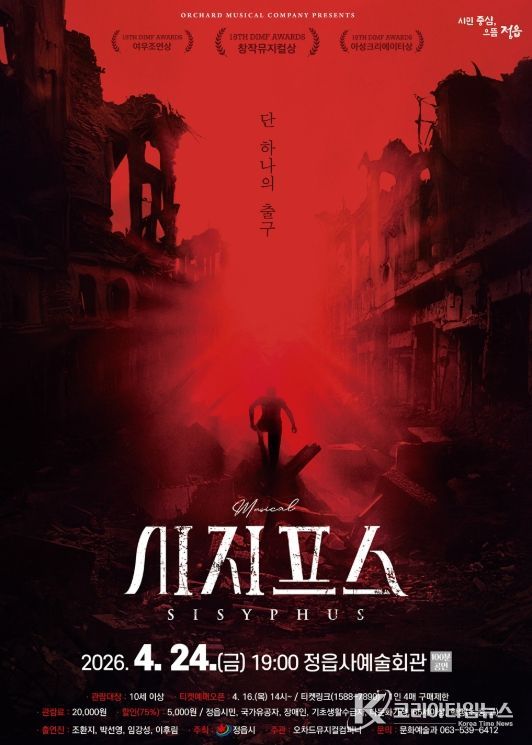 코리아타임뉴스 김태훈 기자 | 정읍시가 시민들에게 수준 높은 문화 향유 기회를 제공하기 위해, 오는 24일 오후 7시 정읍사예술회관에서 창작 음악극(뮤지컬) ‘시지프스’를 무대에 올린다.