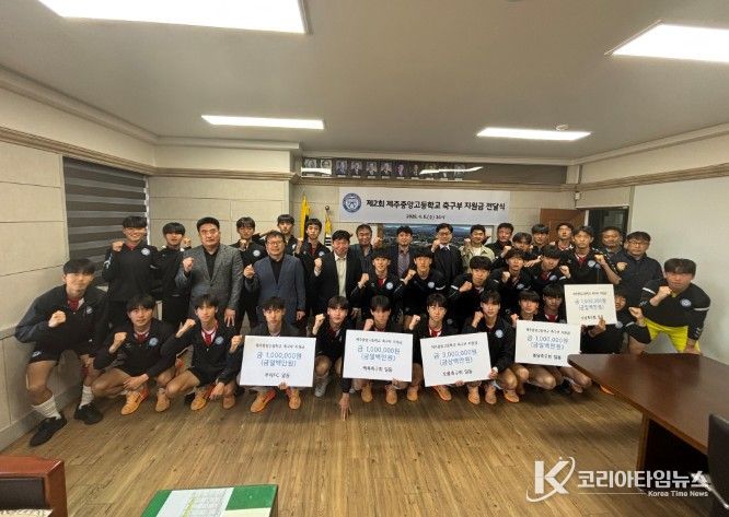 코리아타임뉴스 사회팀 | 제주도교육청 제주중앙고등학교는 8일 도내 생활체육 축구 문화를 이끄는 오름축구회, 돌담축구회, 백록축구회, 소낭축구회, 우리축구회(FC) 등 5개 단체로부터 ‘제2회 제주중앙고 축구부 지원금 전달식’을 통해 장학금 700만원을 전달받았다.