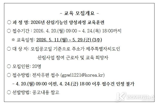 이번 교육은 5월 11일부터 29일까지 3주간 산림조합중앙회 제주지역본부에서 진행되며, 공고일 기준 제주도에 주소지를 둔 도민이면 누구나 신청할 수 있다.