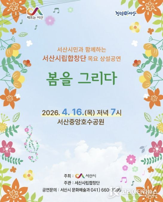 코리아타임뉴스 김택호 기자 | 충남 서산시는 오는 4월 16일 오후 7시 중앙호수공원에서 서산시립합창단의 목요 상설공연이 개최된다고 밝혔다.