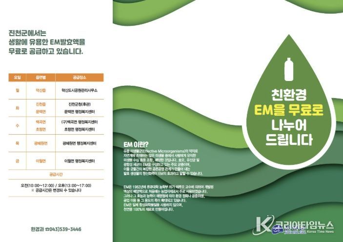 코리아타임뉴스 충북취재본부 | 충북 진천군은 4월부터 악취 제거와 수질 정화에 효과가 있는 친환경 EM 발효액을 무상으로 보급하고 있다고 13일 밝혔다.