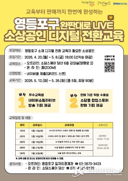 코리아타임뉴스 윤광희 기자 | 영등포구가 관내 소상공인의 온라인 판로 확대를 돕기 위해 ‘상반기 소상공인 디지털 전환 교육’을 개최하고, 오는 20일부터 참가자를 모집한다고 밝혔다.