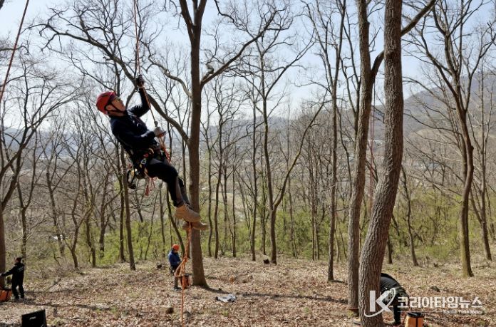 1급 과정을 교육 중인 야외 교육장에서는 10kg이 넘는 묵직한 장비 벨트를 허리에 찬 남성이 능숙하게 로프를 던져 11m 높이의 나무 기둥에 걸었다. 아찔한 높이지만 거침이 없다. 밧줄 하나에 의지해 허공을 오르길 잠시 나무 상단부에 도달한 그가 예리한 톱으로 병든 가지를 골라내자 지켜보던 교육생들 사이에서 응원의 함성이 나왔다.