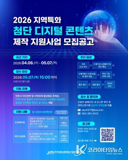 코리아타임뉴스 전북취재본부 | 전주정보문화산업진흥원은 인공지능(AI)과 가상융합기술(XR)을 전주 고유의 문화·역사 자산과 결합하는 ‘지역특화 첨단 디지털 콘텐츠 제작 지원 사업’에 참여할 기업을 모집한다고 13일 밝혔다.