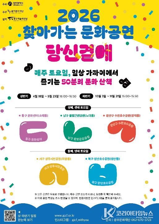 코리아타임뉴스 노승선 기자 | 광주문화재단은 찾아가는 문화공연 '당신곁에' 2026년 상반기 공연이 4월 18일부터 본격 시작된다고 밝혔다.