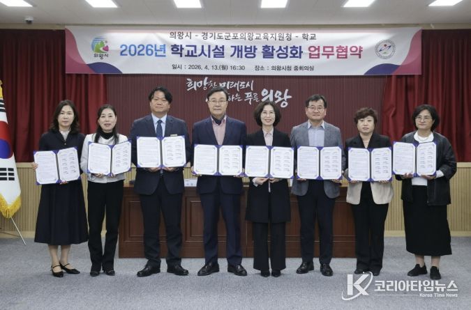 코리아타임뉴스 윤광희 기자 | 의왕시가 4월 13일 시청 중회의실에서 군포의왕교육지원청 및 관내 8개 학교와 ‘학교시설 개방 활성화 추가 업무협약’을 체결했다.