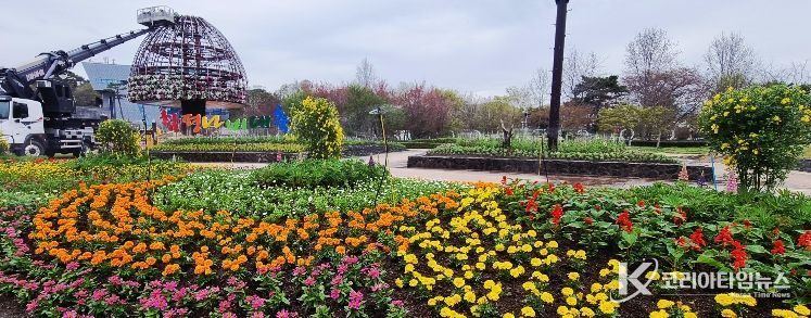 코리아타임뉴스 전남취재본부 | 전남 함평군이 대한민국 대표 봄 축제인 나비대축제 개막을 앞두고 함평엑스포공원에 대형 꽃탑을 설치해 이목을 끈다.