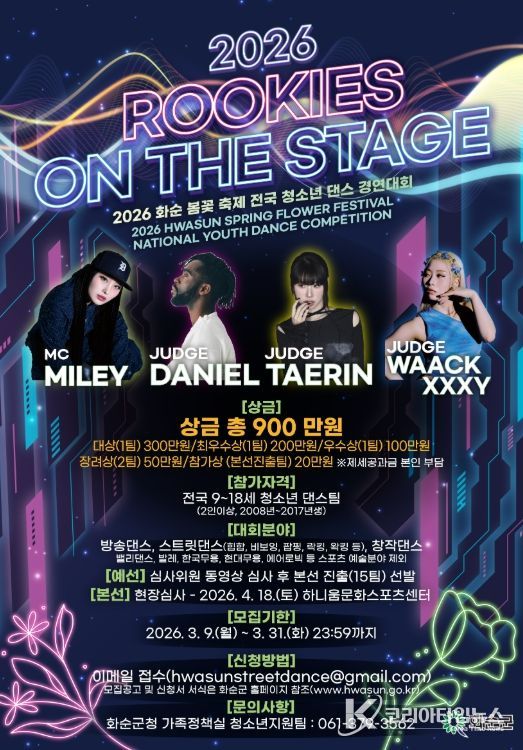 코리아타임뉴스 노승선 기자 | 화순군은 오는 4월 18일 '2026 화순 봄꽃 축제'의 화려한 시작을 알리는 ‘제3회 전국 청소년 댄스 경연 대회’ 본선을 개최한다고 밝혔다.