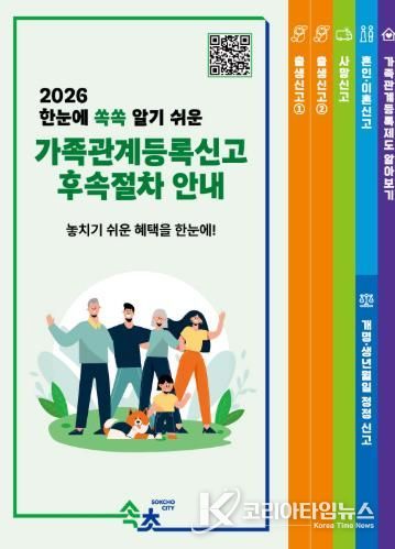 코리아타임뉴스 이아름 기자 | 속초시는 가족관계등록신고 이후 필요한 각종 후속 행정절차를 시민들이 보다 쉽고 편리하게 이해하고 이행할 수 있도록 가족관계등록신고 후속절차 안내 리플릿을 제작해 시청 종합민원실과 8개 동 주민센터에 배포한다.