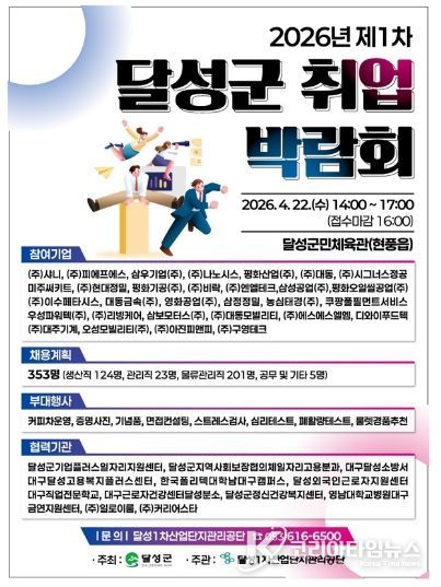 코리아타임뉴스 노승선 기자 | 달성군은 지역 경제 활성화와 고용난 해소를 위해 오는 4월 22일 오후 2시부터 달성군민체육관에서 ‘2026 제1차 달성군 취업박람회’를 개최한다.