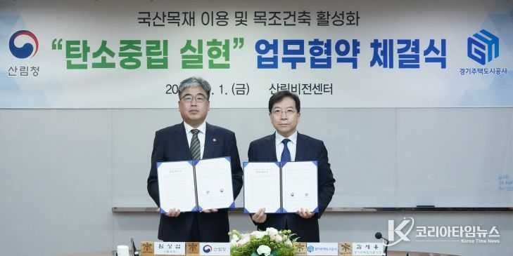 코리아타임뉴스 권충현 기자 | 산림청과 경기주택도시공사(사장 김세용)는 서울 여의도 산림스마트워크 회의실에서 탄소중립을 실현하기 위한 국산 목재 이용 및 목조건축 활성화 업무협약(MOU)을 체결했다고 1일 밝혔다.