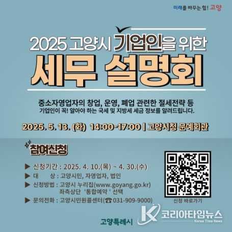 코리아타임뉴스 기동취재팀 | 고양특례시는 오는 5월 13일 시청 문예회관에서 ‘2025 고양시 기업인을 위한 세무 설명회’를 개최한다고 밝혔다.