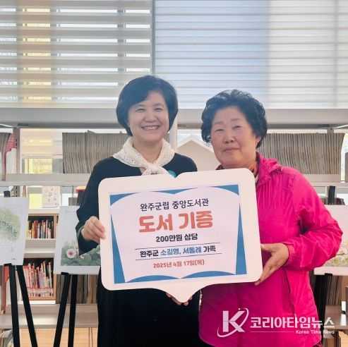 코리아타임뉴스 전북취재본부 | 완주군 봉동읍에 거주하는 소길영, 서동례 가족이 완주군에 도서 110권을 기증했다.
