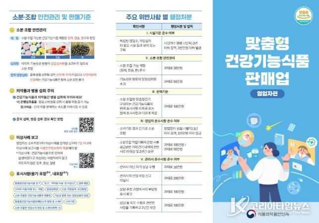 참고로 식약처는 맞춤형 건강기능식품에 대한 이해도를 높이기 위해 맞춤형 건강기능식품 소분·조합 안전관리, 이상사례 보고 및 표시사항, 주요 위반사항 등을 안내하는 ‘맞춤형 건강기능식품 법령·제도 등에 관한 종합안내서’를 발간했으며, 자세한 내용은 식약처 누리집이나 식약처 식품안전나라 누리집에서 확인할 수 있다.