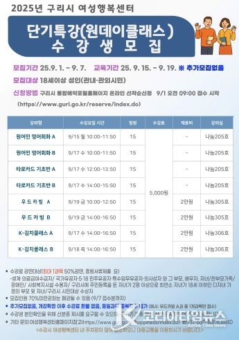 코리아타임뉴스 경기취재본부 | 구리시 여성행복센터는 오는 9월 1일부터 7일까지 2025년 ‘원데이클래스’ 수강생을 모집한다.