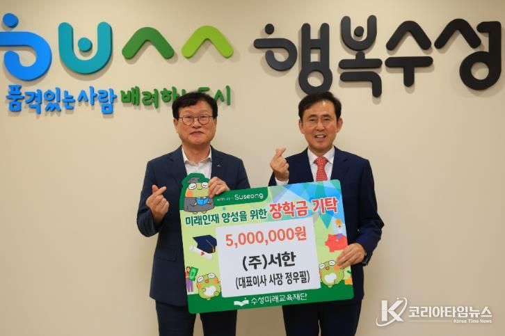 코리아타임뉴스 한장선 객원기자 | ㈜서한은 지난 22일 미래 인재 육성과 지역 교육 경쟁력 강화를 위해 장학금 500만 원을 수성미래교육재단에 기탁했다.