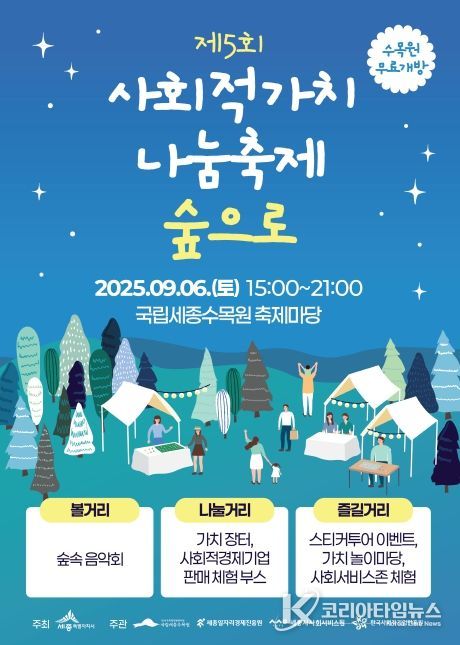 코리아타임뉴스 세종취재분부 | 세종일자리경제진흥원은 9월 6일 토요일 ‘제5회 사회적가치 나눔축제 숲으로’를 개최한다고 밝혔다.