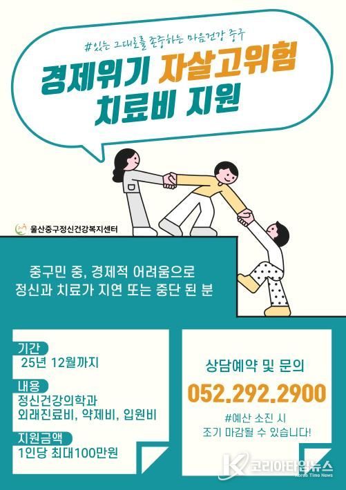 코리아타임뉴스 울산취재본부 | 울산 중구보건소에서 운영하는 울산중구정신건강복지센터가 경제적 어려움으로 정신질환 치료를 미루거나 중단한 취약계층을 대상으로 정신질환 치료비 지원사업을 운영한다.