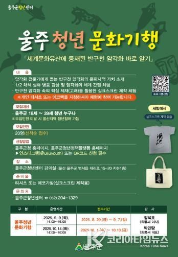 울주군 관계자는 “이번 문화기행은 청년들이 지역의 소중한 문화유산을 직접 체험하며 창의성과 감수성을 발휘하는 기회가 될 것”이라며 “지역 정체성과 문화적 자긍심을 높이는 데도 큰 의미가 있다”고 말했다.