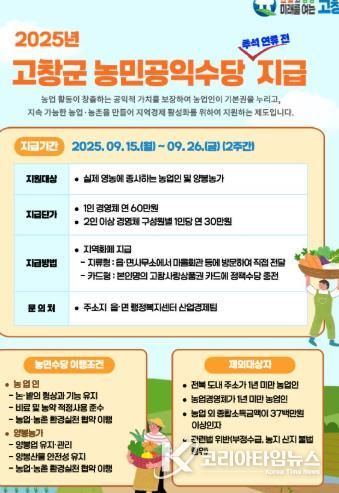 코리아타임뉴스 전북취재본부 | 고창군이 농업인의 생활 안정과 지역경제 활성화를 위해 ‘농민 공익수당’을 추석 명절 전에 지급한다.