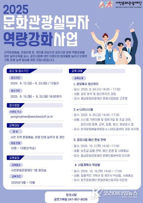 코리아타임뉴스 충남취재본부 | 서천문화관광재단은 지역 문화·관광단체 실무자 및 지역주민을 대상으로 공모사업 참여역량 강화를 위한‘2025 문화관광실무자 역량강화사업’참여자를 이달 23일까지 모집한다.