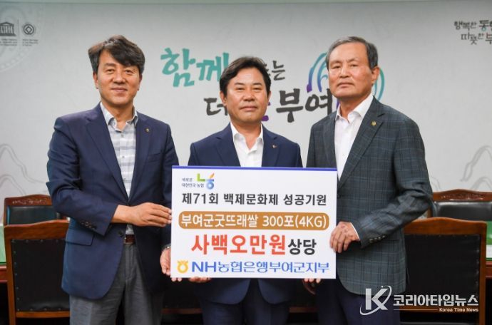 코리아타임뉴스 충남취재본부 | 부여군은 지난 9월 22일 군수실에서 제71회 백제문화제의 성공적인 개최를 기원하는 NH농협은행 부여군지부(지부장 류경환) 기부금 전달식을 진행했다.