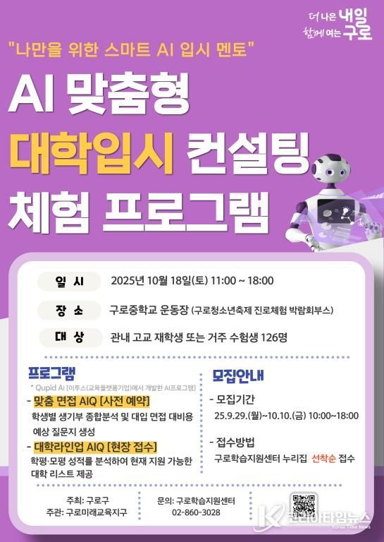 코리아타임뉴스 윤광희 기자 | 구로구가 10월 18일 오전 11시부터 구로중학교 운동장에서 AI와 함께하는 대학 입시 상담(컨설팅)을 개최한다고 밝혔다.