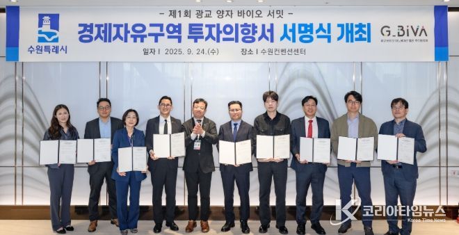 코리아타임뉴스 경제팀 | 제1회 광교 양자 바이오 서밋에 참가한 9개 첨단바이오 기업이 경제자유구역 투자의향서에 서명했다.