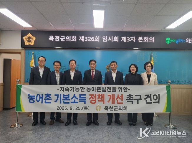 코리아타임뉴스 박찬식 기자 | 옥천군의회는 지난 25일 열린 제326회 임시회 제3차 본회의에서 송윤섭 의원이 대표발의한 '농어촌 기본소득 정책 개선 촉구 건의안'을 채택했다고 밝혔다.