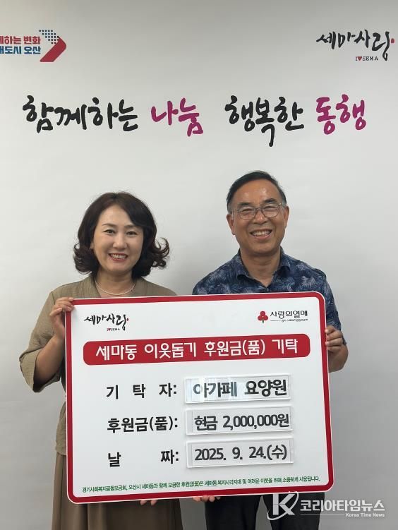 코리아타임뉴스 윤광희 기자 | 오산시 세마동은 지난 24일 아가페 요양원에서 지역 내 저소득 취약계층을 돕기 위한 성금을 기탁했다고 밝혔다.