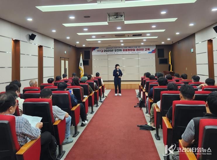코리아타임뉴스 윤광희 기자 | 오산시는 지난 24일 오산시 환경사업소 홍보관에서 2025년 공중화장실 관리인 교육을 실시했다고 밝혔다. 이번 교육은 '오산시 공중화장실 등의 설치 및 관리 조례' 개정 이후 지난해에 이어 두 번째로 마련됐다.