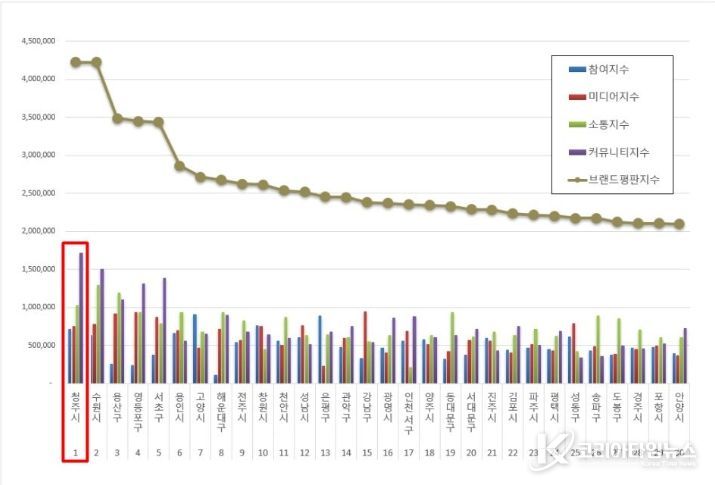 청주시는 △참여지수 718,537 △미디어지수 758,600 △소통지수 1,030,780 △커뮤니티지수 1,717,444로 총합 4,225,361을 기록했다.