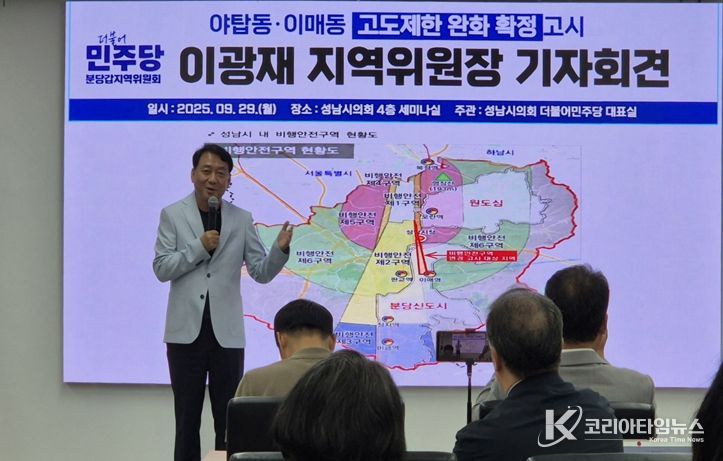 코리아타임뉴스 윤광희 기자 | 더불어민주당 분당갑 이광재 지역위원장은 29일 기자회견을 통해 “주민들의 오랜 숙원인 서울공항 주변 고도제한 완화가 결실을 맺게 된 것은 주민들의 인내와 연대, 그리고 함께해 온 노력 덕분”이라고 밝혔다.