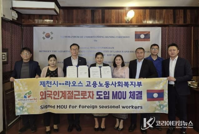 코리아타임뉴스 충북취재본부 | 제천시는 지난 9월 30일 라오스 노동사회복지부와 외국인 계절근로자 도입을 위한 신규 업무협약(MOU) 을 체결했다. 이번 협약은 농번기 원활한 인력 공급을 위해 추진된 것으로, 특히 농촌 인력 공급 국가를 다변화해 불확실성을 최소화하는 데 목적이 있다.