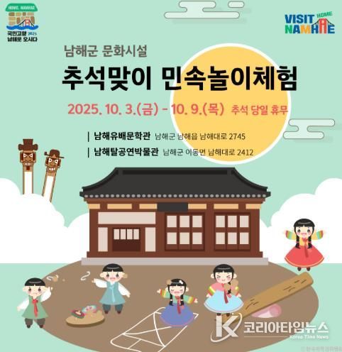 코리아타임뉴스 오영주 기자 | 남해군은 추석 연휴 기관 남해유배문학관과 남해탈공연박물관에서 명절 맞이 민속놀이 체험을 진행한다고 밝혔다.