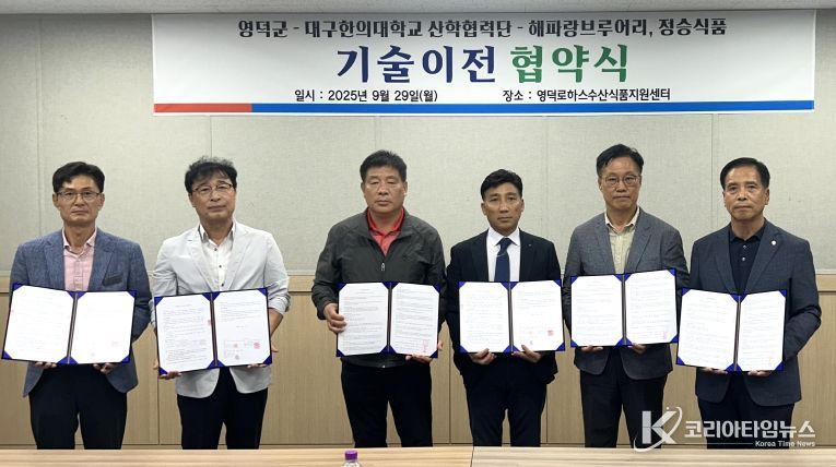 코리아타임뉴스 윤경수 기자 | 영덕군과 로하스수산식품지원센터를 위탁 운영하는 대구한의대학교 산학협력단, 그리고 관내 농산물법인 해파랑브루어리와 수산물업체 정승식품이 지난 29일 산·학·연·관 간 기술이전 협약을 체결했다.