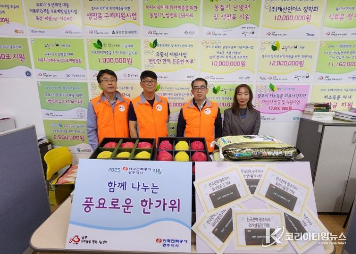 코리아타임뉴스 사회팀 | 한국전력공사 광주지사는 1일 광주시 남부 무한돌봄 행복나눔센터를 방문해 지역 내 취약계층을 위한 120만 원 상당의 물품(식료품, 외식상품권 등)을 기탁했다.
