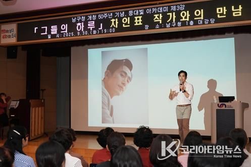 코리아타임뉴스 부산취재본부 | 부산 남구는 지난 9월 30일 남구청 개청 50주년을 맞이해, 구청 1층 대강당에서 '제20기 등대빛 아카데미' 3강으로 배우 겸 작가 차인표 씨를 초청해 특별강연을 열었다.